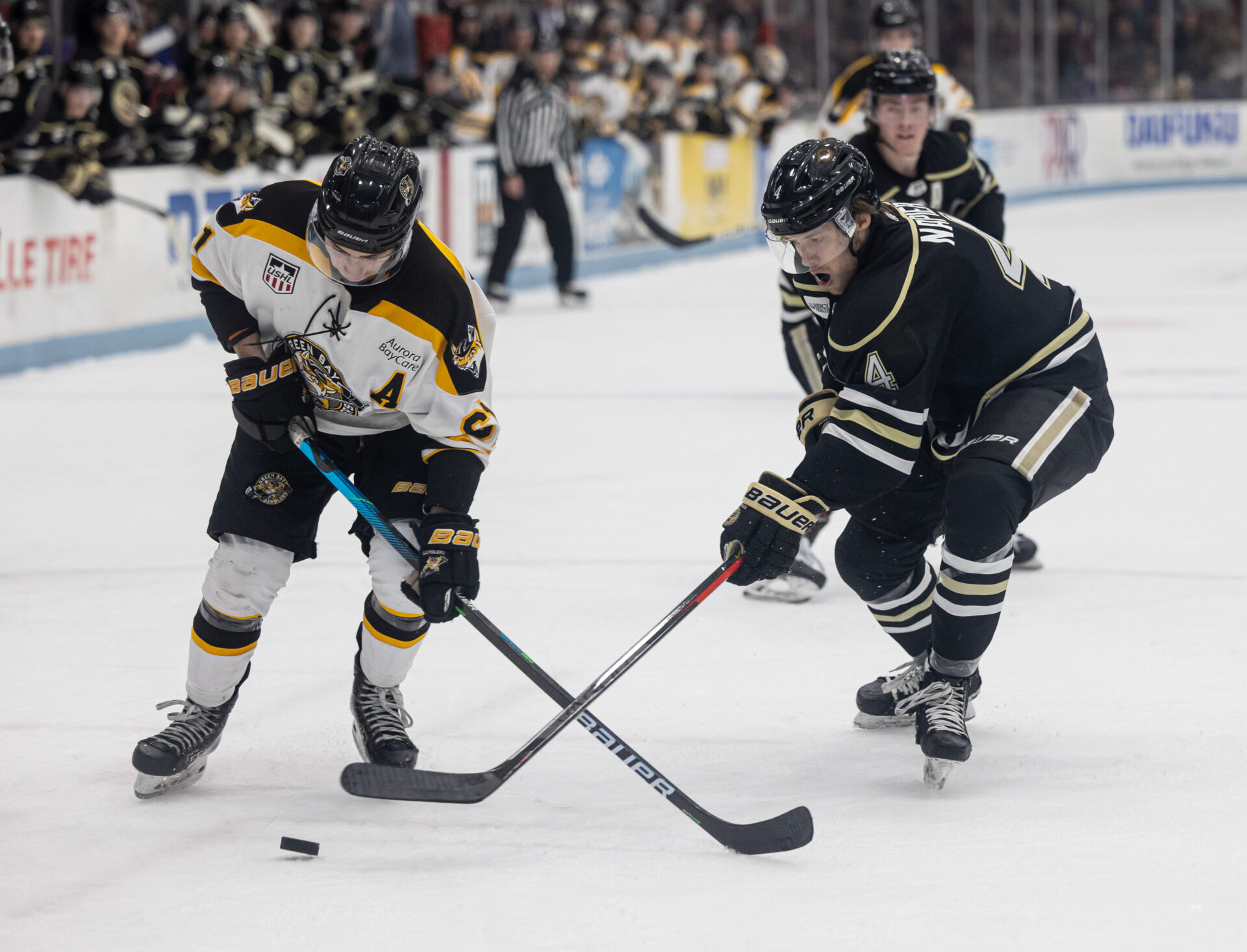 Green Bay tied the score with a goal from Cam Lund at the 8:07 mark, then Muskegon pulled ahead 2-1 on a long shot by Noah Ellis that found the Gambler net with about six minutes left in the first.