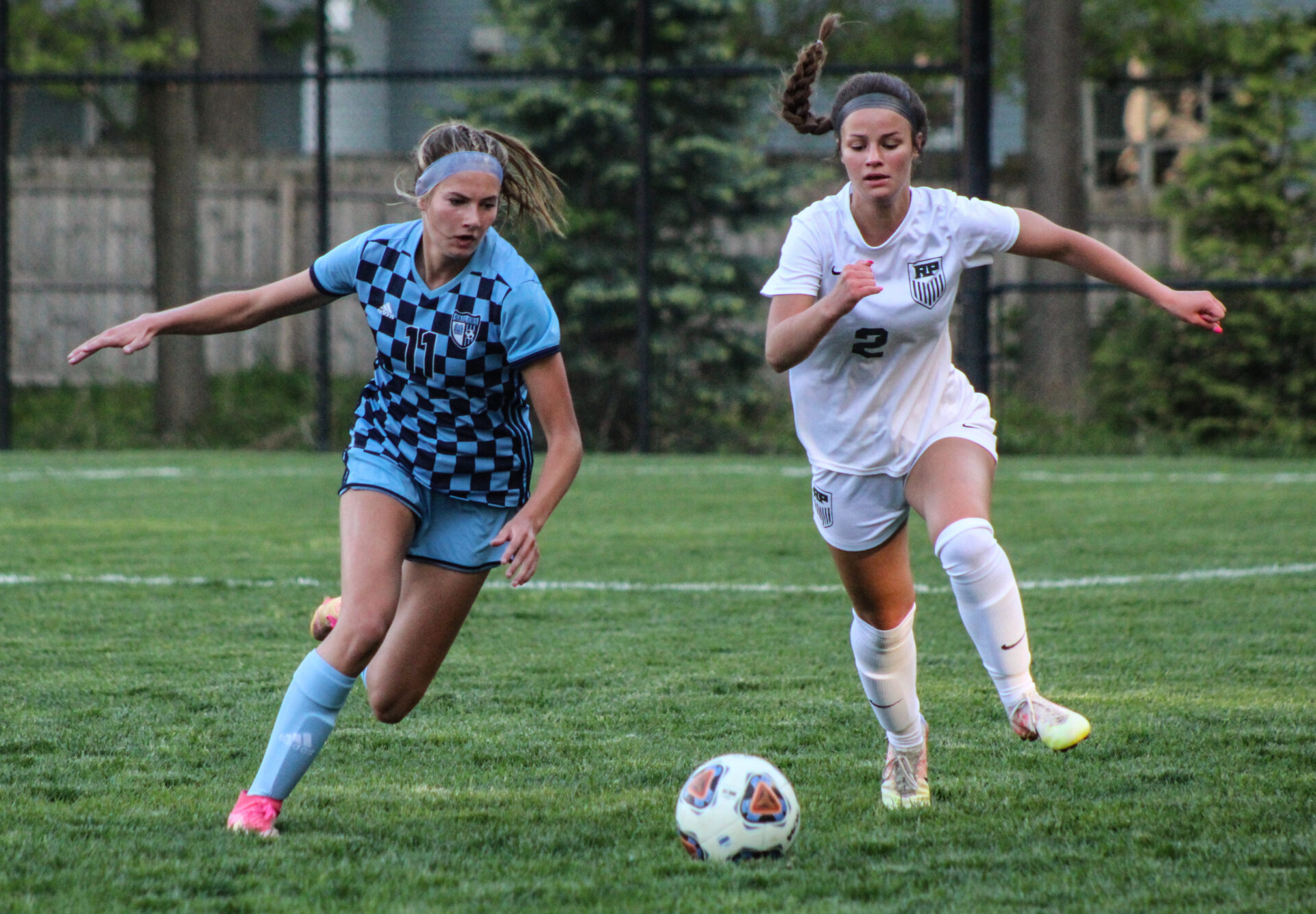 Mona Shores’ Shay Norden (11) and Reeths-Puffer’s Grace Goodell (2) race for the ball. Photo/Steve Gunn