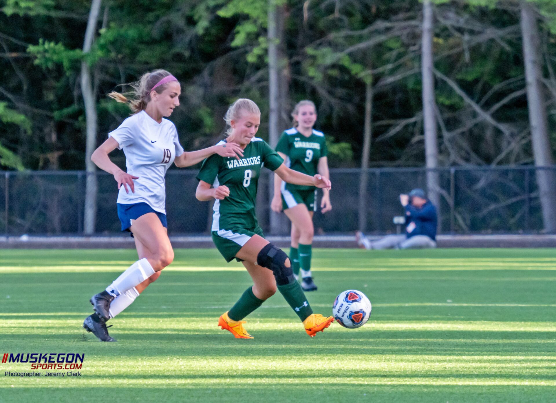 WMC’s Sydney Betten (8) works to keep the ball away from North Muskegon’s Katie Kinahan. Photo/Jeremy Clark