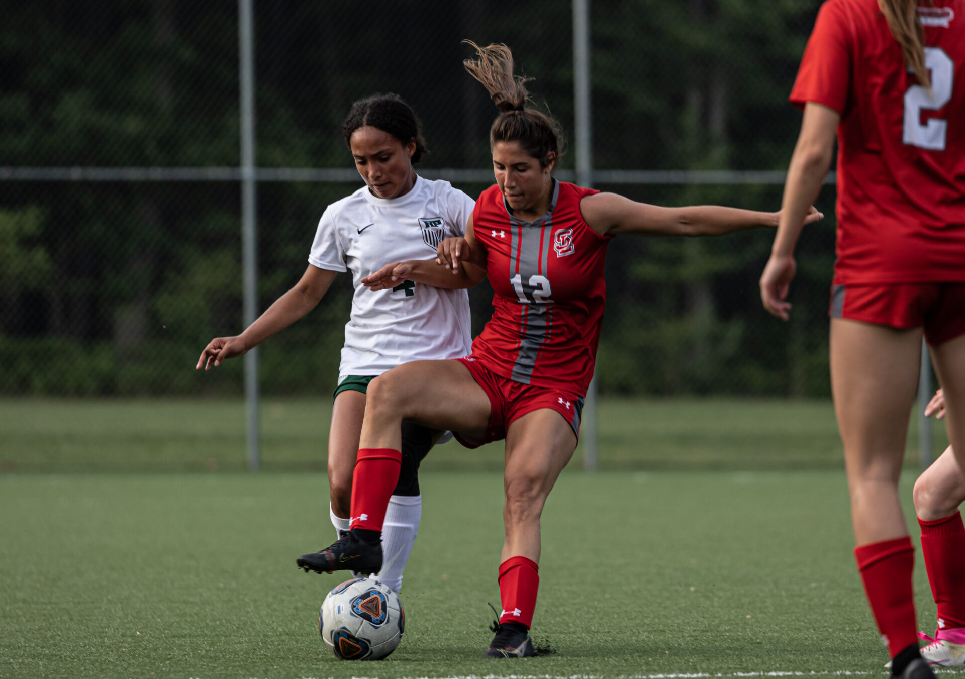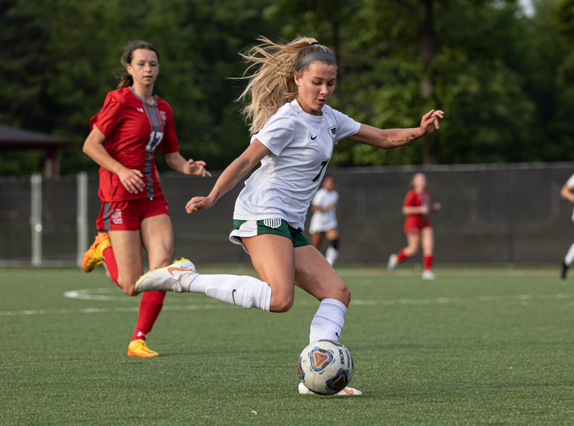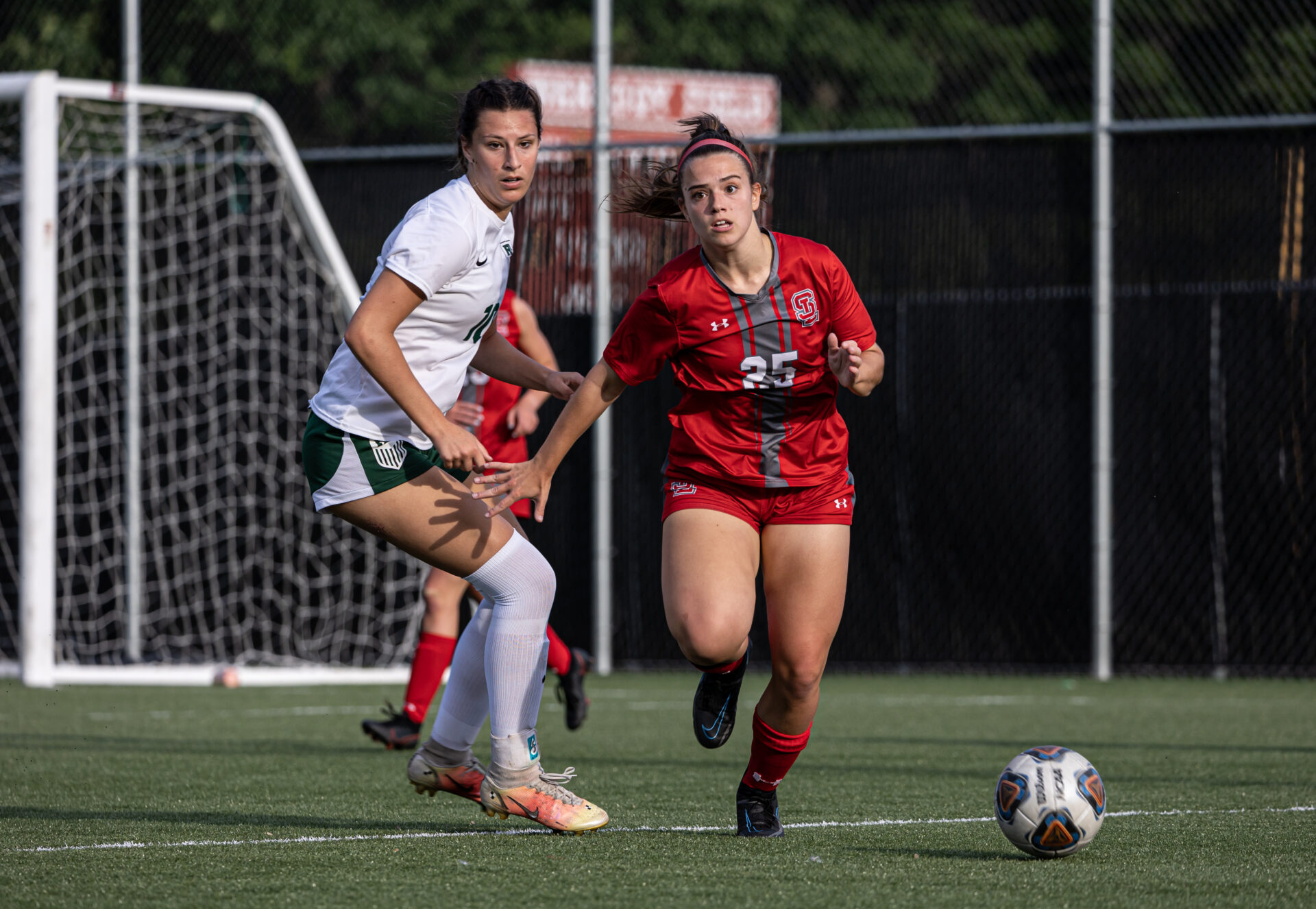 Spring Lake’s Ella Rabideau (25) pursues the ball with R-P’s Sophia Hekkema in close pursuit. Photo/Tonya Pardon
