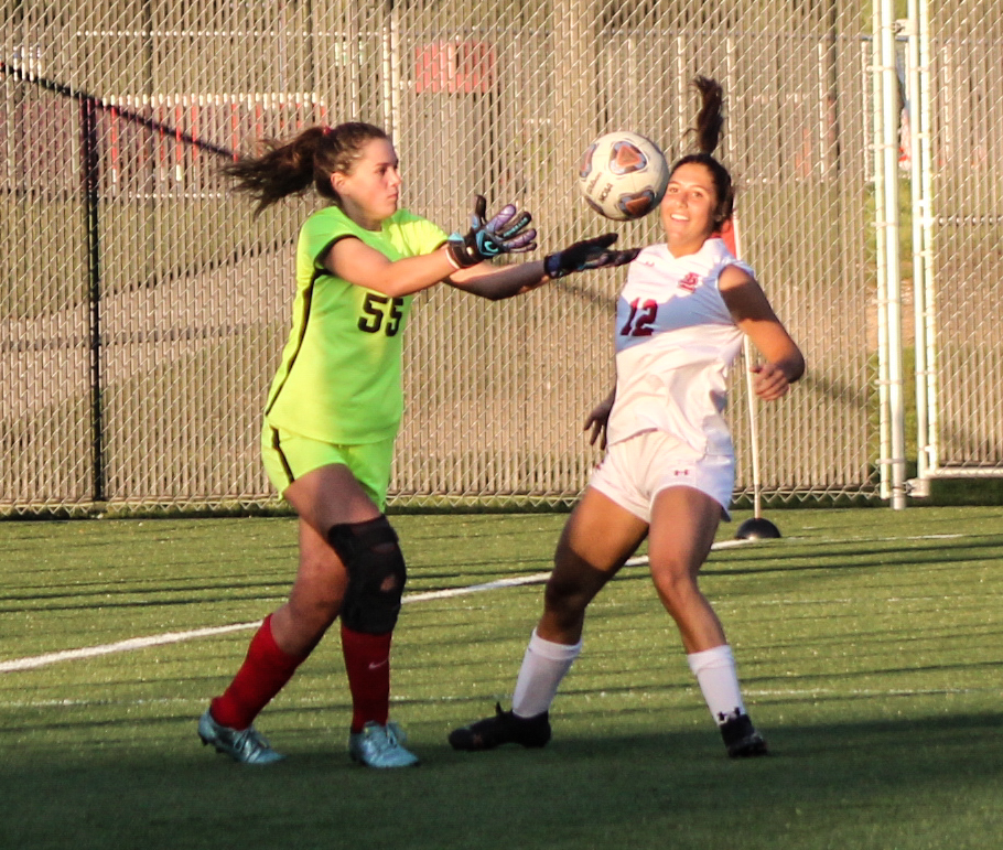 Meah Bajt watches as the Whitehall goalkeeper gets ready to grab the ball out of the air. Photo/Steve Gunn