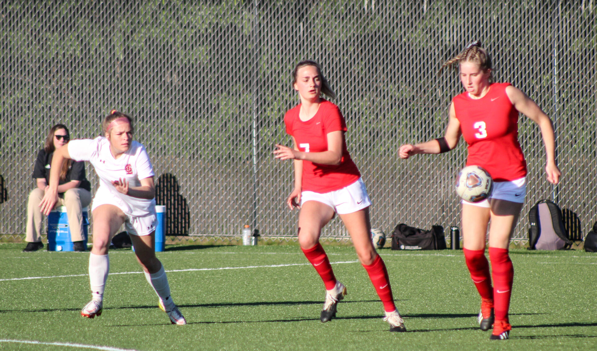 Whitehall’s Charley Klint (3) tries to get control of the ball while teammate Avery Thomas watches. Photo/Steve Gunn