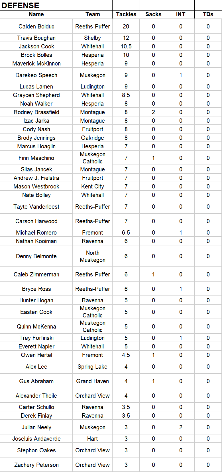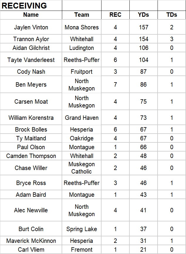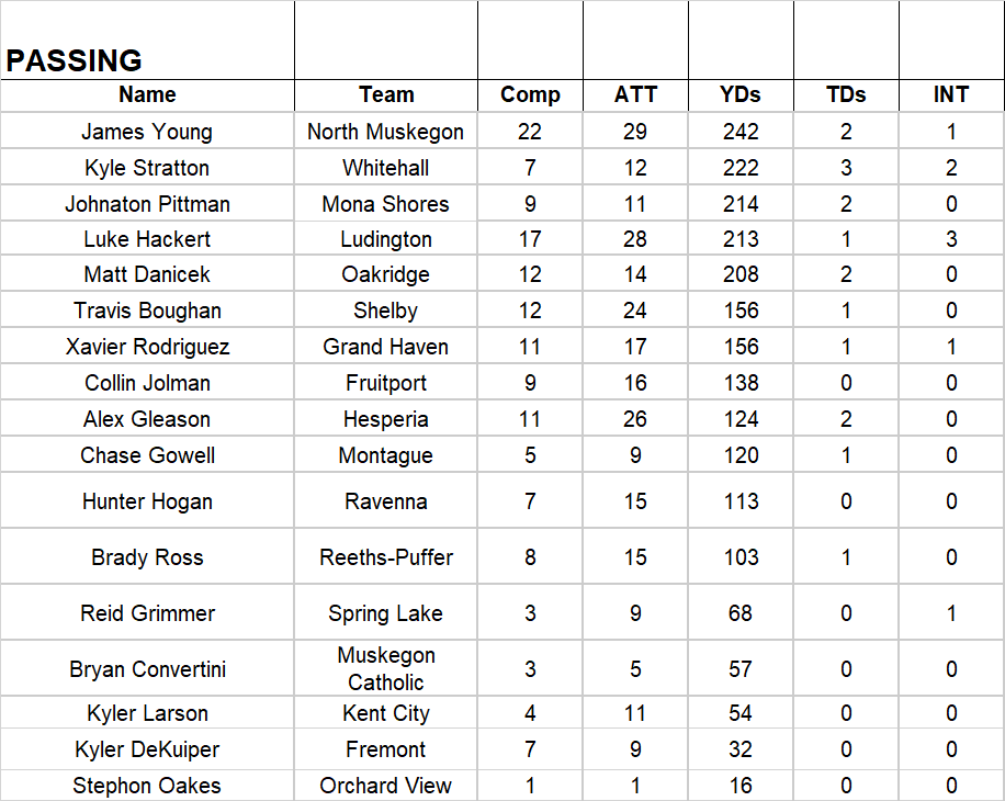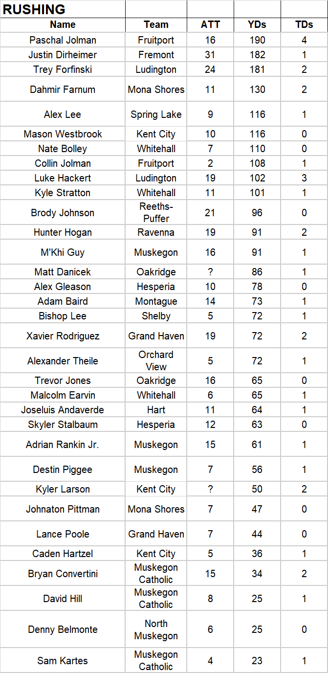 The following are statistical charts for players from high school football teams in the MuskegonSports.com coverage area.