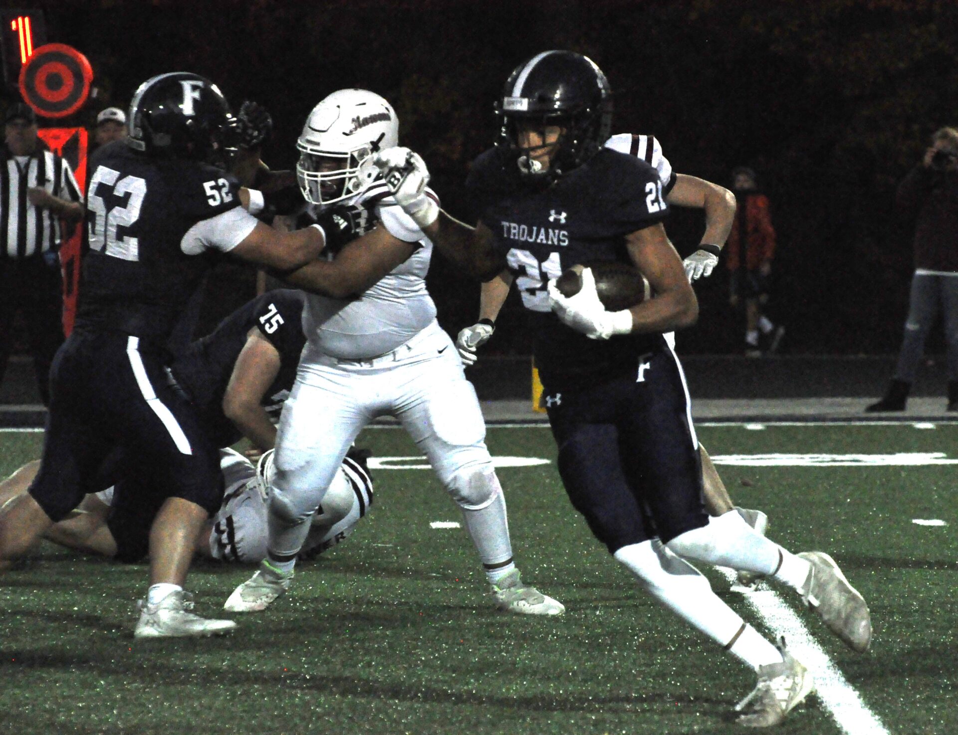 After an Eli Boyce three-yard touchdown run cut the Trojan lead to 8-6, Collin Jolman punched in a one-yard score to give Fruitport a 16-6 lead with 6:21 left in the second quarter.
