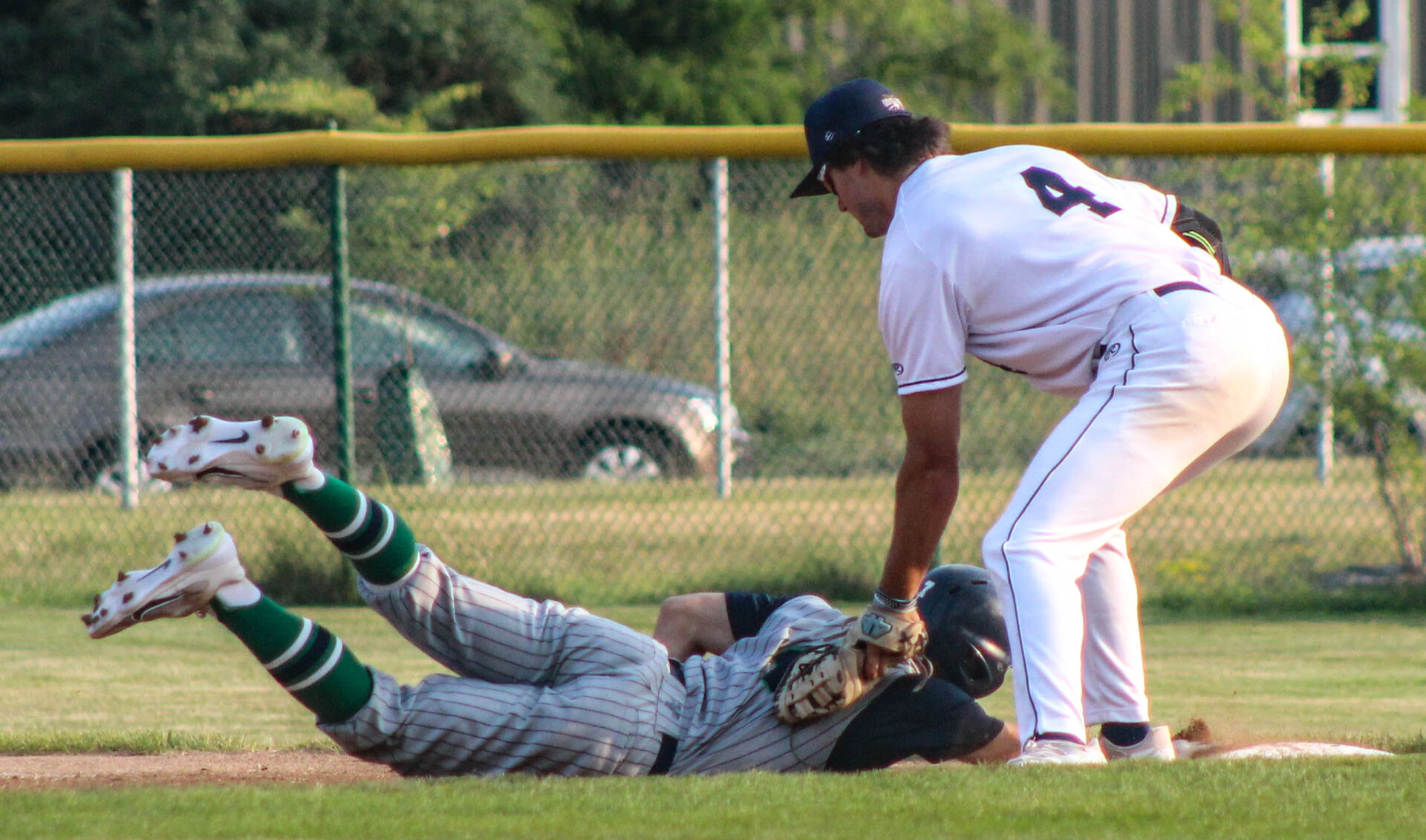 Clippers first baseman Aidan Arbobast puts the tag on a runner during a pickoff attempt.