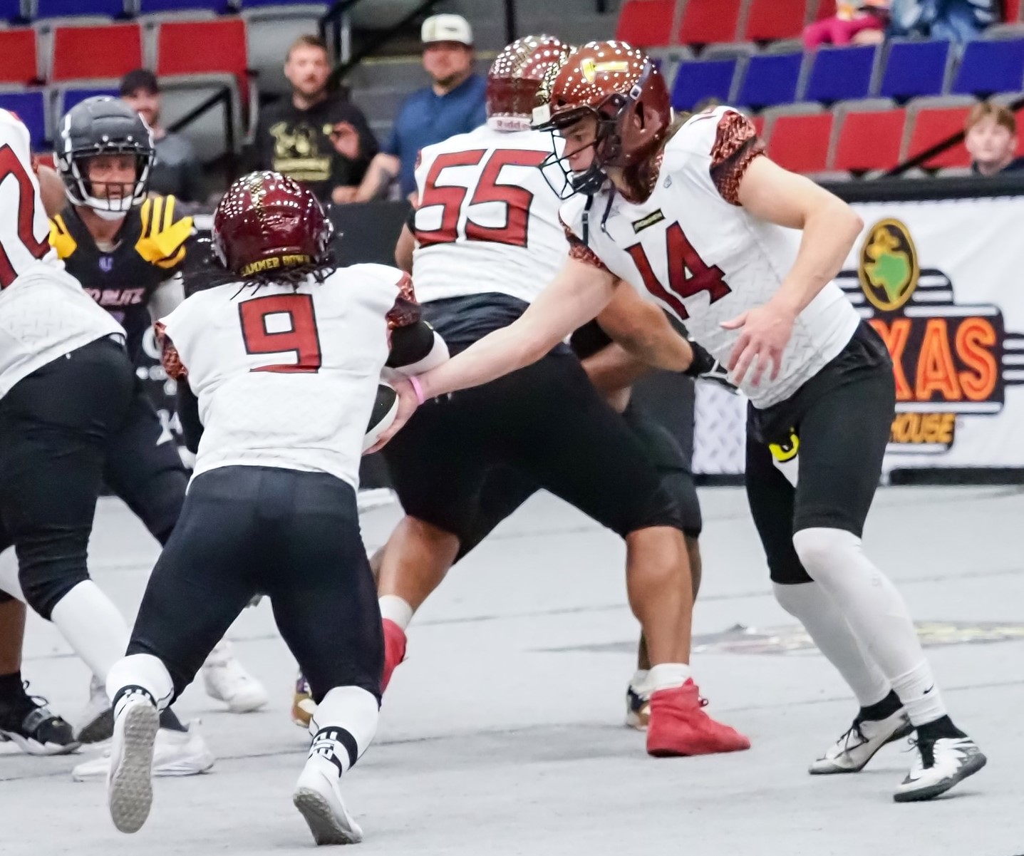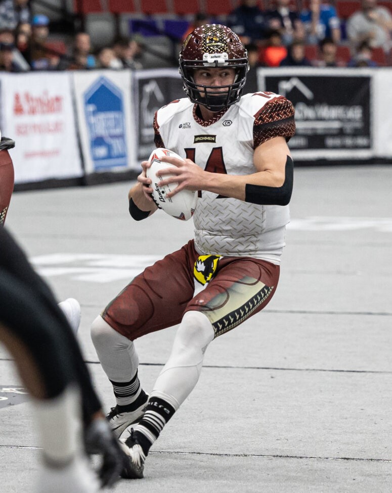 He was really good again last year, completing 65 of 104 passes for 941 yards and 33 touchdowns. He was great in the league championship game, completing 18 of 28 passes for 242 yards and a pretty amazing nine touchdowns, helping the Ironmen beat the Southern Michigan Apex 81-25.