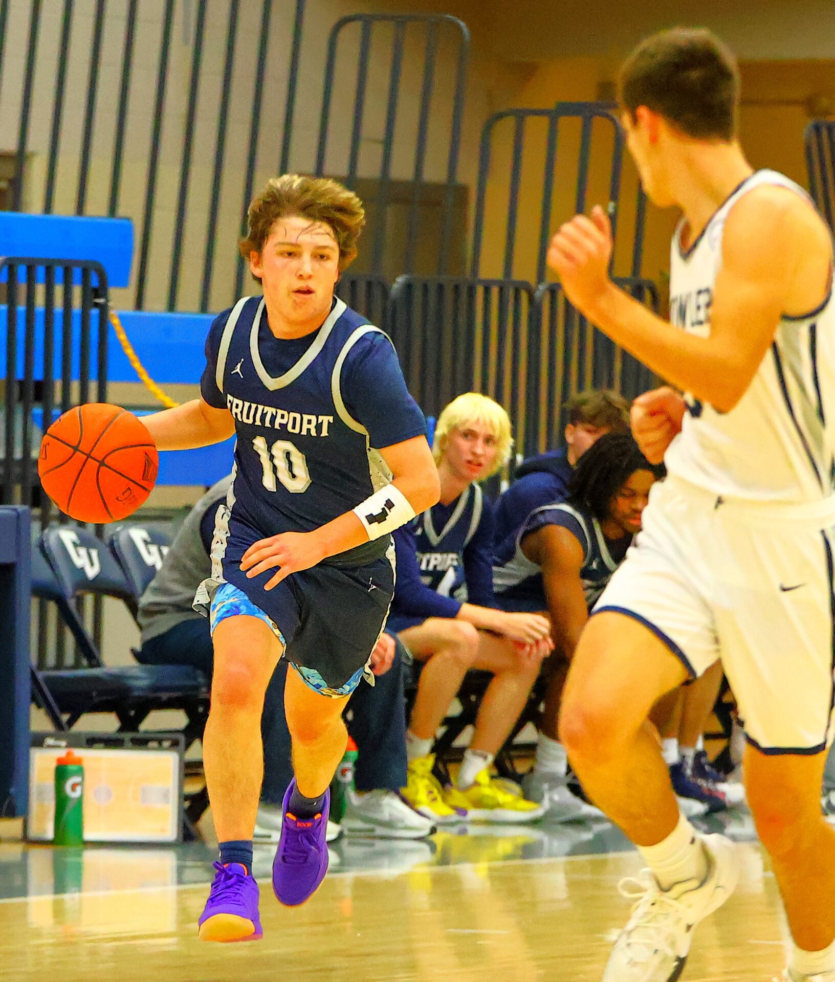 Fruitport’s Grade Anspach moves the ball up the court. Photo/John Willoughby