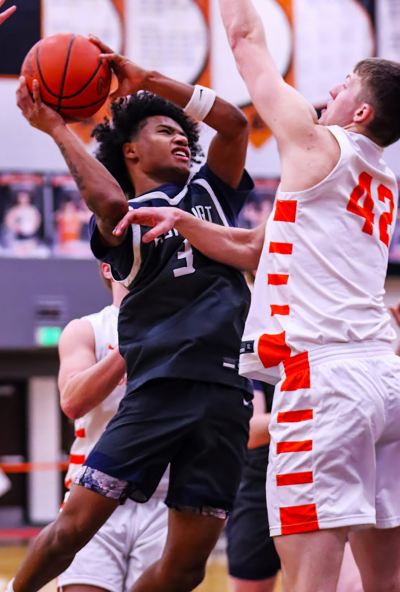 Fruitport’s DayDay Williams battles to the basket. Photo/Angela Rusnak