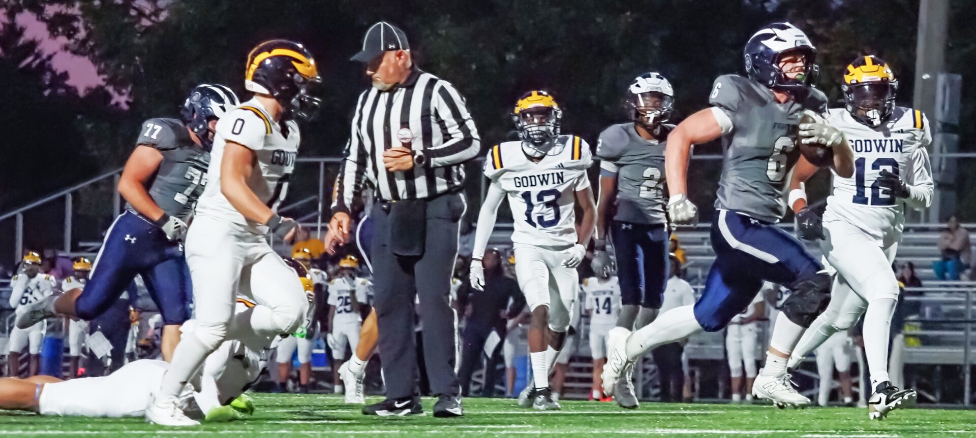 Fruitport’s DayDay Williams was returning the opening kickoff near midfield when Godwin Heights forced a fumble. Thaddeus McCranie recovered for the Wolverines and took off into the open field – but he ran the wrong way, toward his team’s own end zone, resulting in a safety.