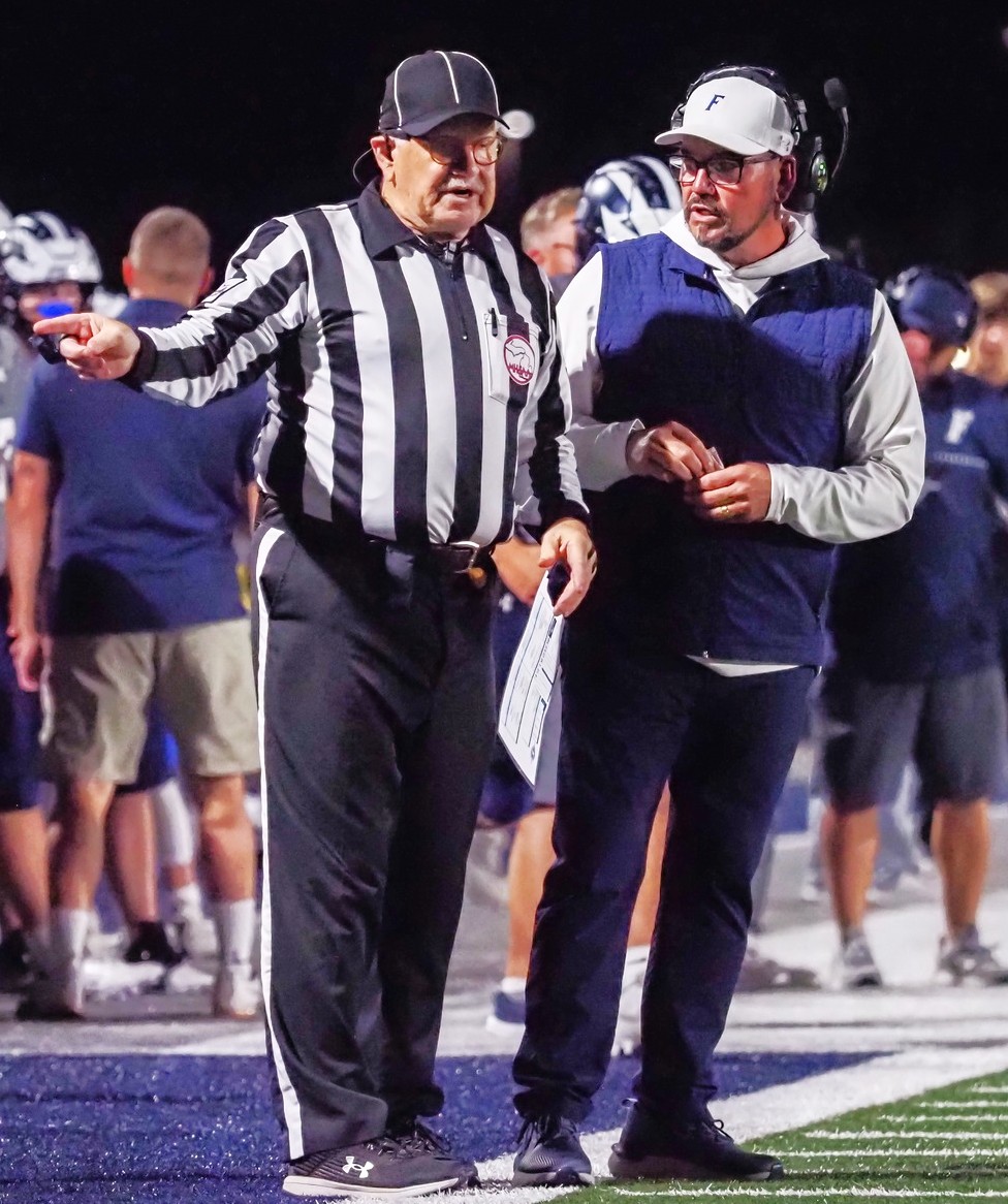Fruitport coach Nate Smith talks to a ref during Friday’s penalty-filled contest. Photo/Jeremy Clark