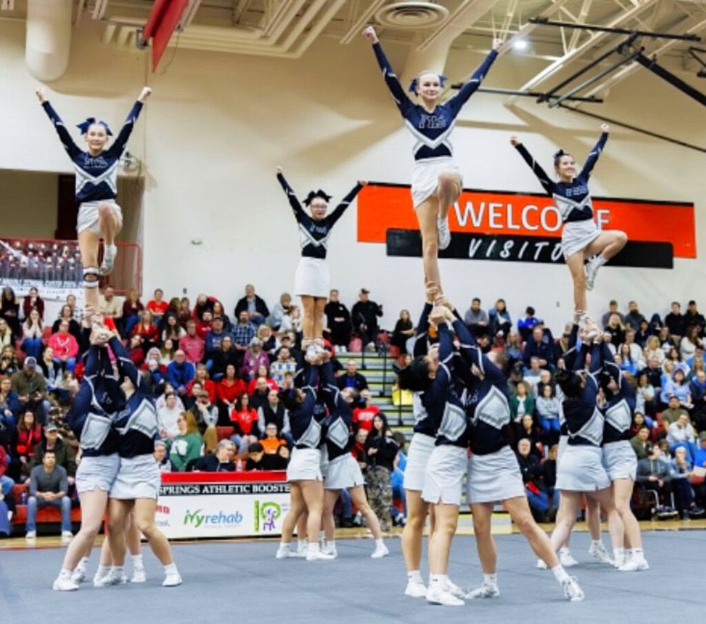 They responded to the pressure, however, posting a big 297 score in the third round – stunts – and finishing 15 points ahead of Comstock Park – 715.44-700.50. That kept the conference championship at home for another near.
