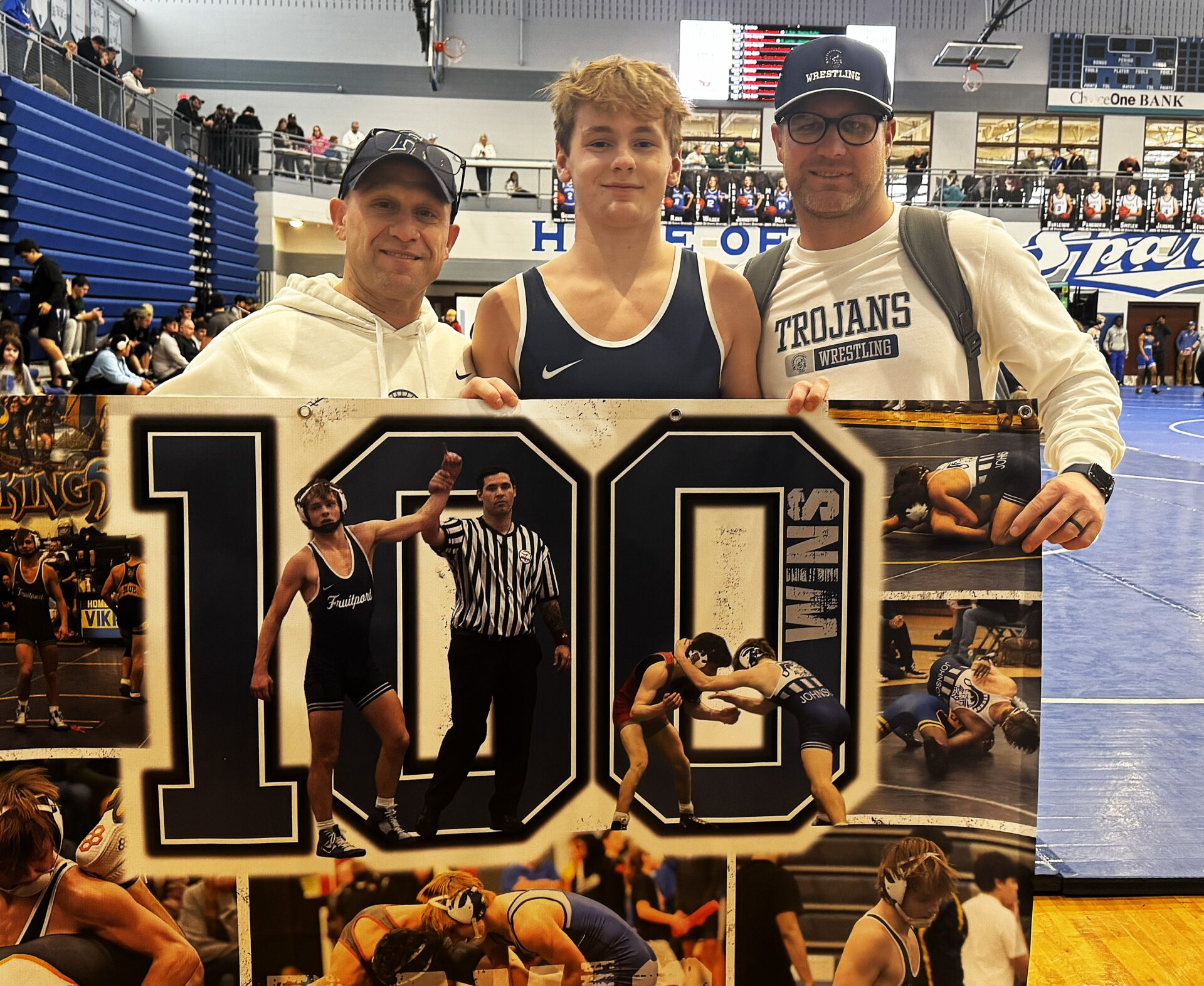 His third match of the day turned out be a really special one, because he earned the 100th victory of his varsity career, a milestone that few high school wrestlers reach.