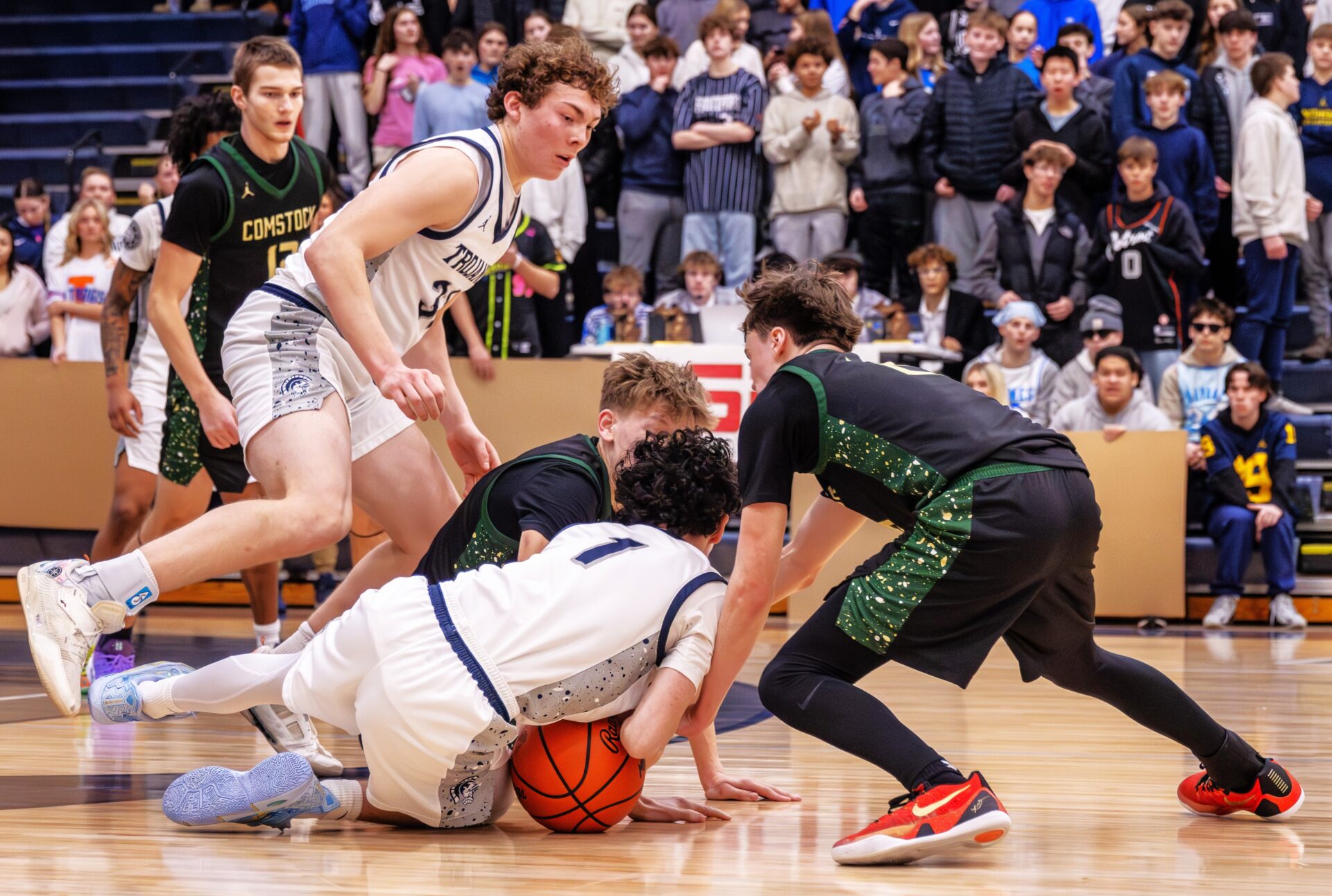 Fruitport’s Wyatt Fielstra (1) fights for a loose ball. Photo/Angela Rusnak