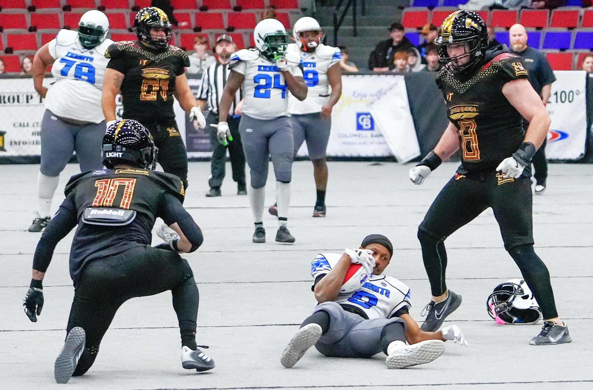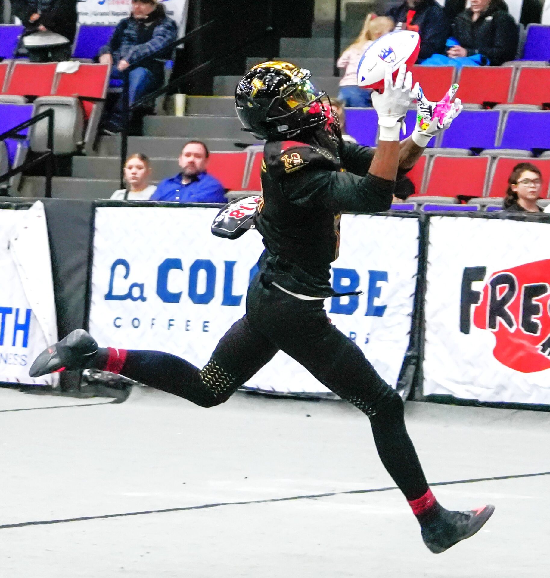 The Muskies also had a field goal, which is rare in Trinity Health Arena with its low ceiling, low-hanging scoreboard and the narrow goal posts. They also scored two more points on an even more unusual play, when one of their kickoffs went through the uprights.